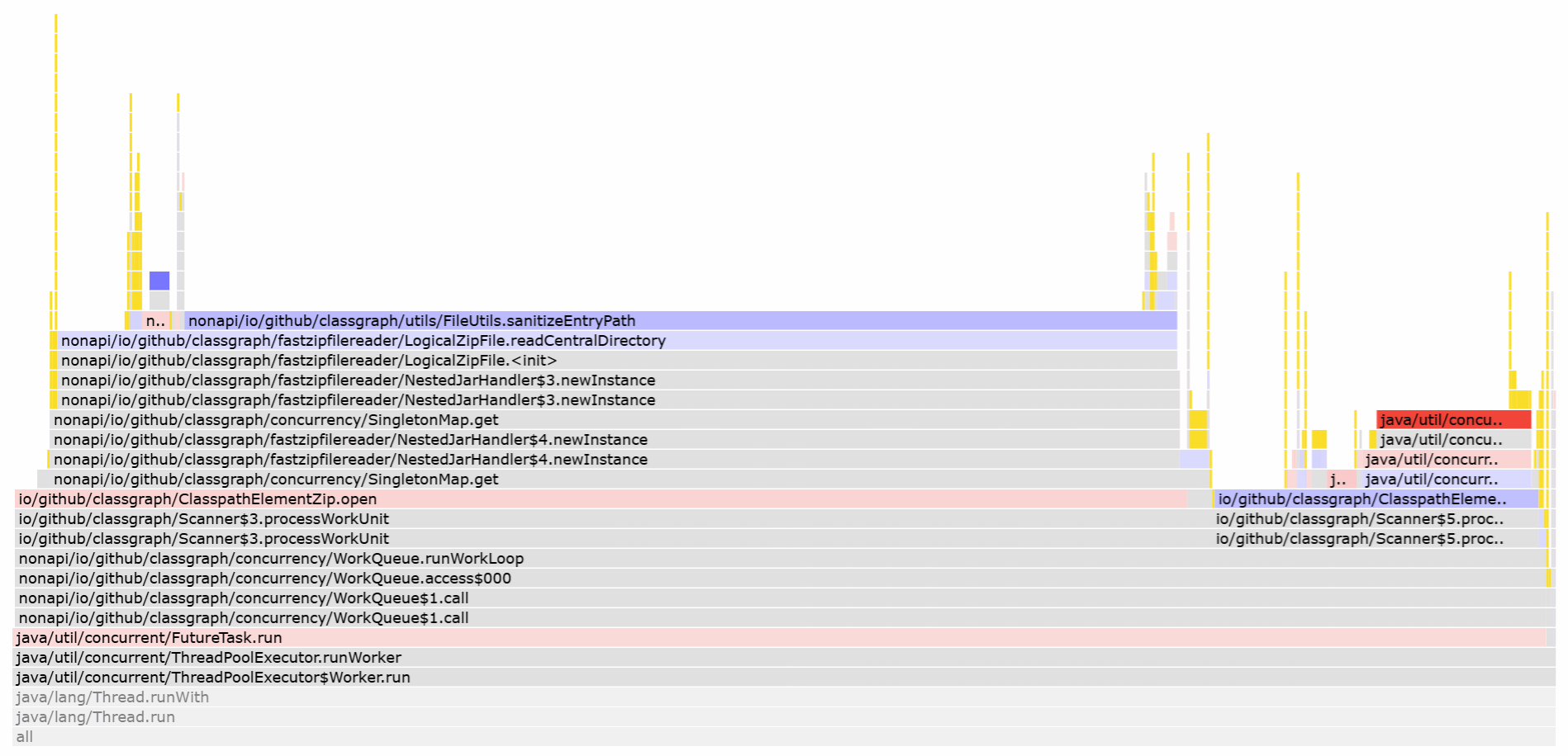 To find performance regressions, it may be useful to compare current profile to a previous one that serves as a baseline. Differential Flame Graph visualizes such a comparsion with a special color scheme: