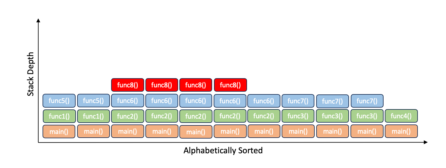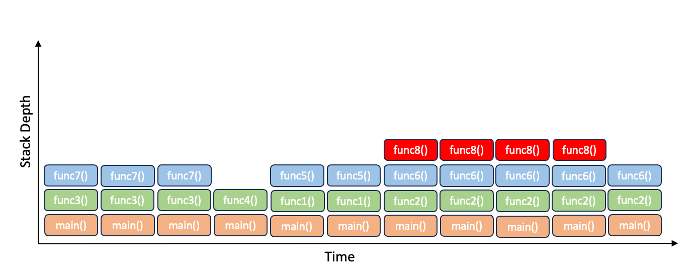Profiling starts by taking samples X times per second. Whenever a sample is taken, the current call stack for it is saved. The diagram below shows the unsorted sampling view before the sorting and aggregation takes place.