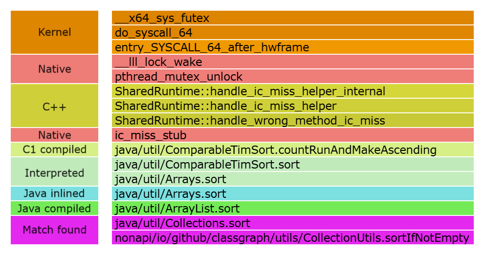 Color is another flame graph dimension that may be used to encode additional information about each frame. Colors may have different meaning in various flame graph implementations. async-profiler uses the following palette to differentiate frame types: